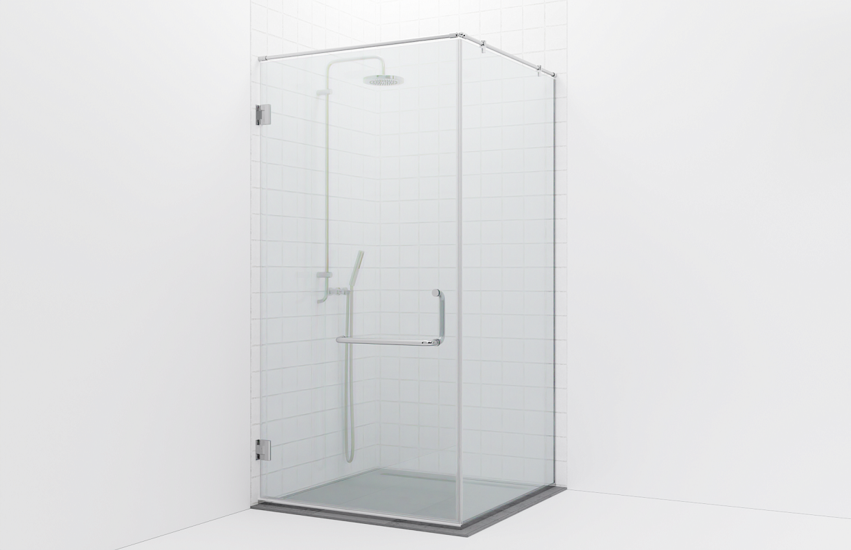 Комплект фурнитуры для угловой душевой перегородки с дверью на двух петлях. Крепление стекла в опорный профиль и штангу. Гидроизоляция обеспечена уплотнителями. Стекло в комплектацию не входит.