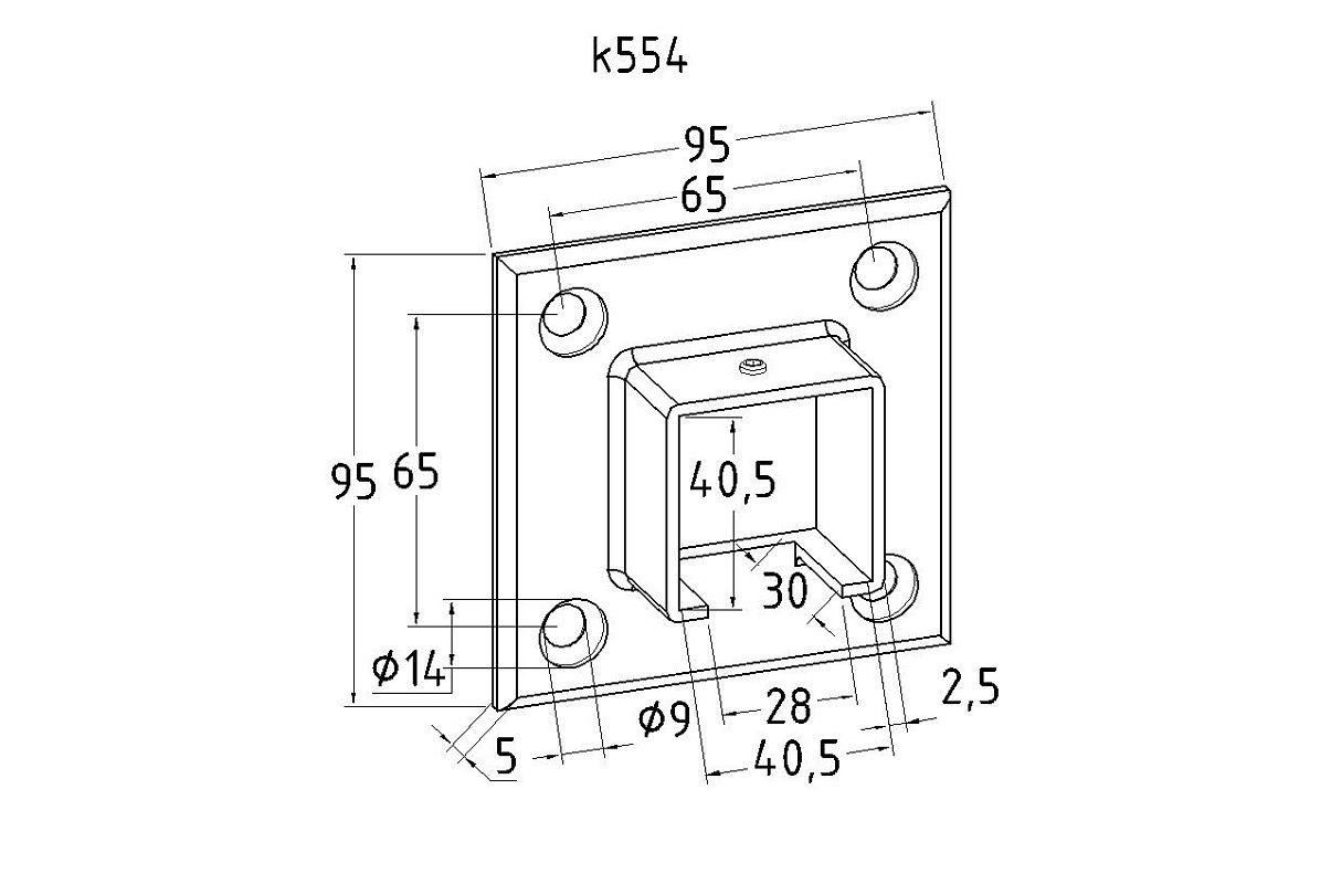 Модель выполнена размерностью специально под трубу 40х40 с пазом 24х24 (k856). Применяется для крепления трубы 40х40 мм поручня лестничных перил в стену на объектах с несущим стеклом или с подсветкой.
