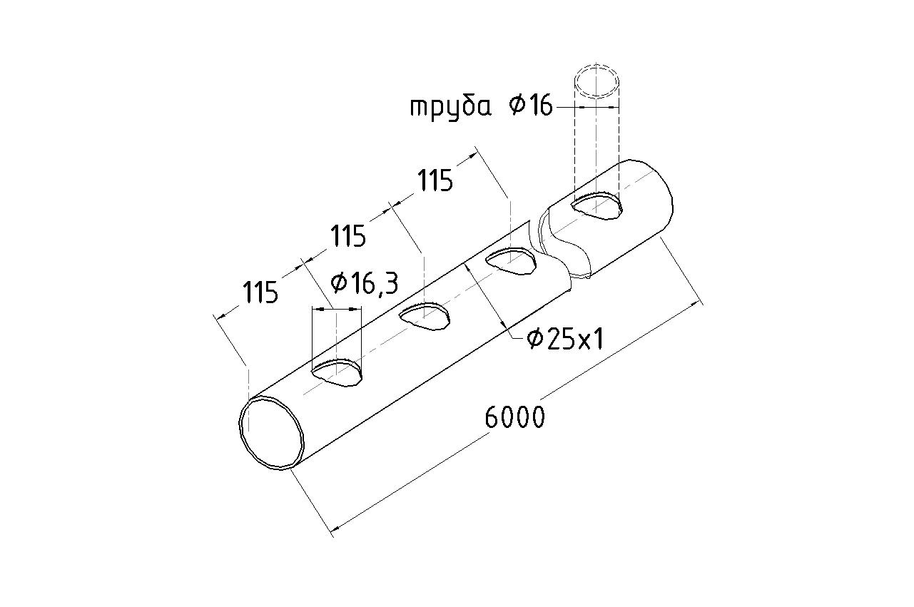 В конструкции предусмотрены круглые отверстия. Марка стали: AISI 304 — устойчива к коррозии, подходит для эксплуатации в условиях повышенной влажности. Размеры: 25 мм (наружный диаметр) × 1 мм (толщина стенки) × 6000 мм (длина). Перфорация: отверстия Ø16 мм с шагом под углом 90°. Обработка поверхности: GRIT 600 — полированная.
