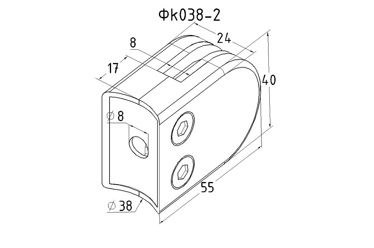 Фk038-2 стеклодержатель штампованный под стекло 8 мм под стойку Ø38.1 мм 40х24х54 шлифованный (AISI 304)