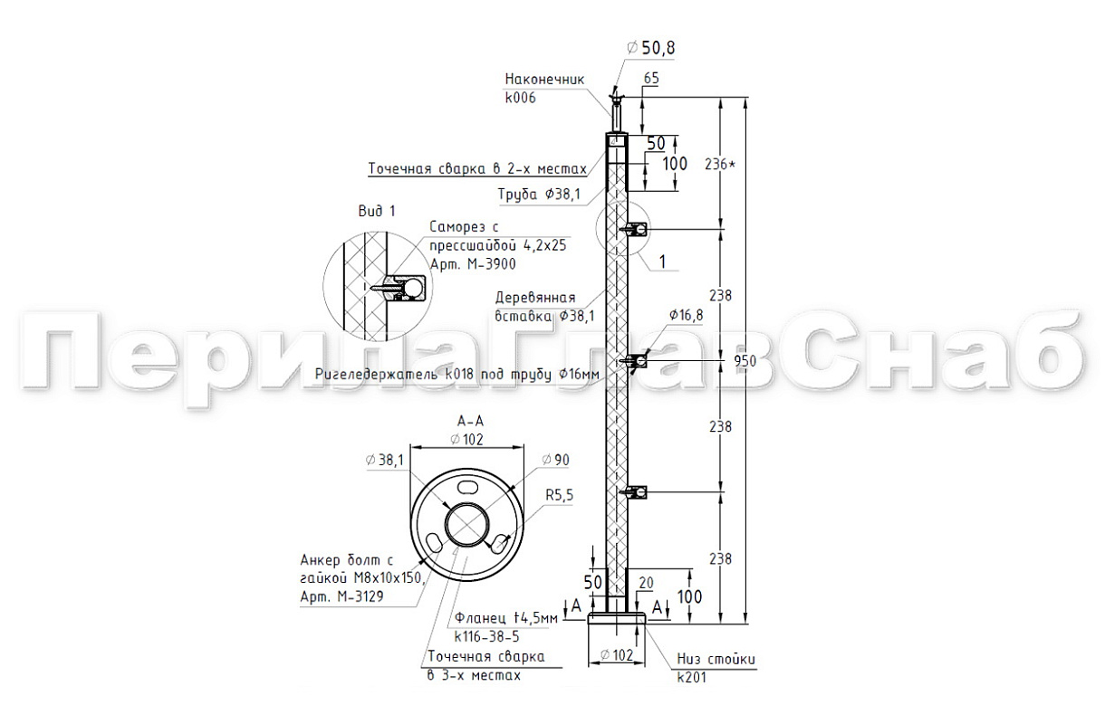 Готовая стойка Ø38,1 мм, с фланцем и наконечником, высота 950 мм, полированная (AISI 304) k702 купить в Воронеже