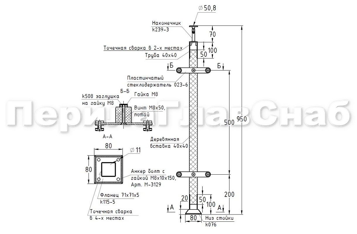 Готовая стойка 40х40х950 мм, деревянная, со вставками из нержавеющей стали 2х100 мм с 3 ригеледержателями k740-1-G купить в Воронеже