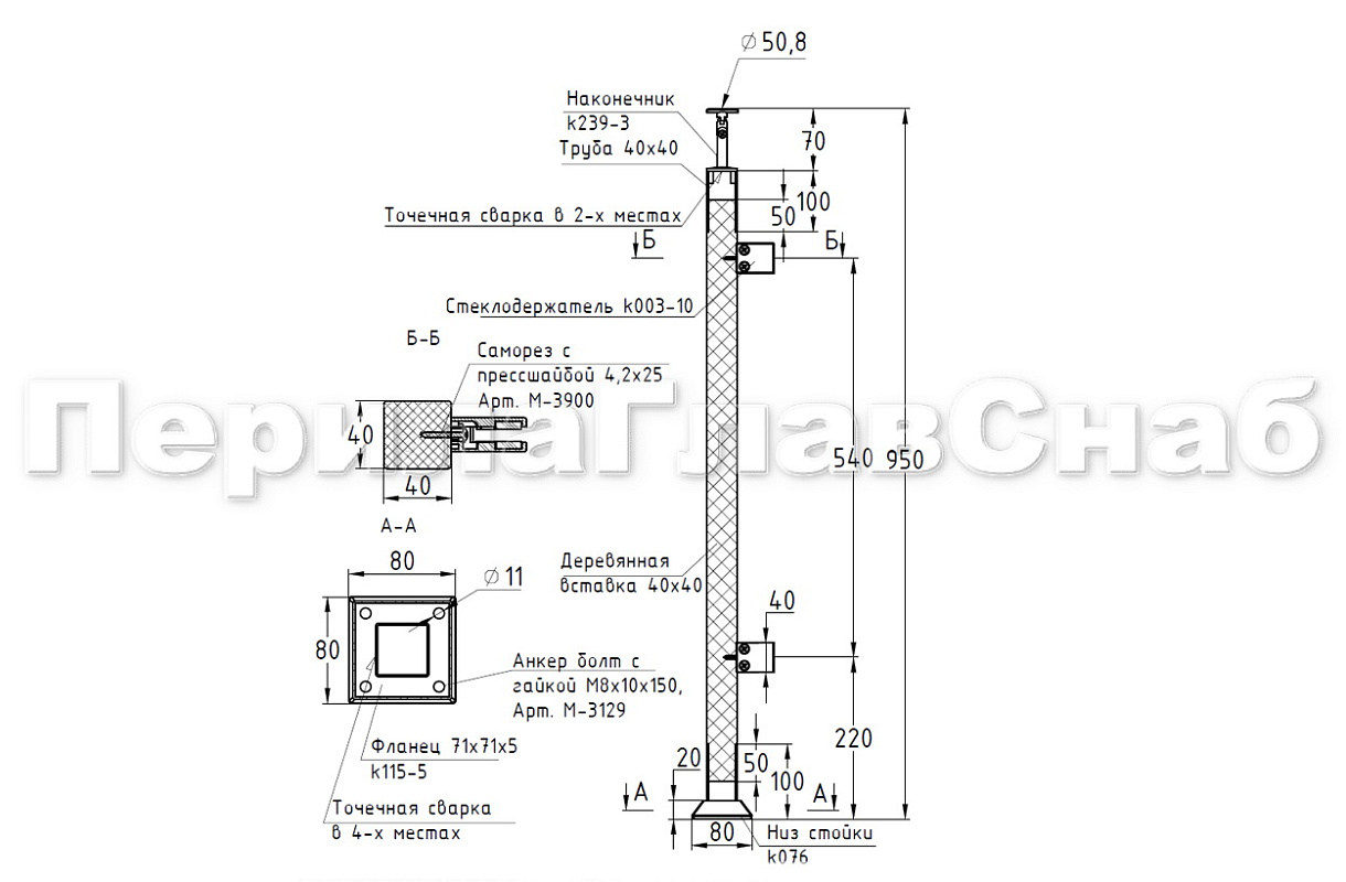 Готовая стойка 40х40х950 мм, деревянная, со вставками из нержавеющей стали 2х100 мм с 3 ригеледержателями k740-1-G купить в Воронеже