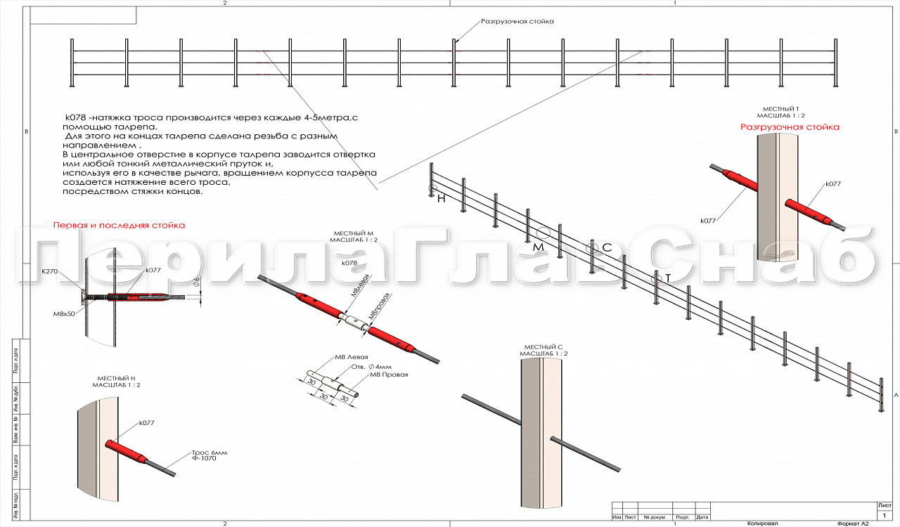 Служит для натяжения тросов в ограждениях. На концах талрепа при помощи зажимных винтов фиксируются трос. Для этого в центральной части талрепа сделана резьба с разным направлением вращения. В центральное отверстие в корпусе талрепа заводится любой тонкий металлический пруток и, используя его в качестве рычага, вращением корпуса талрепа создается натяжение всего троса, посредством стяжки концов.