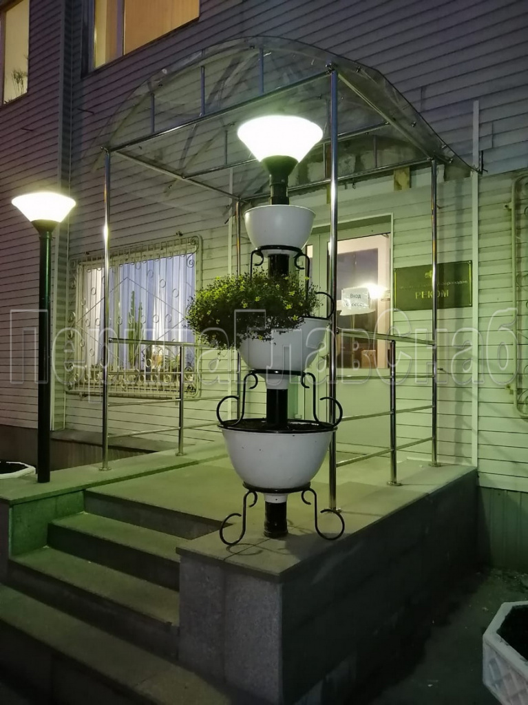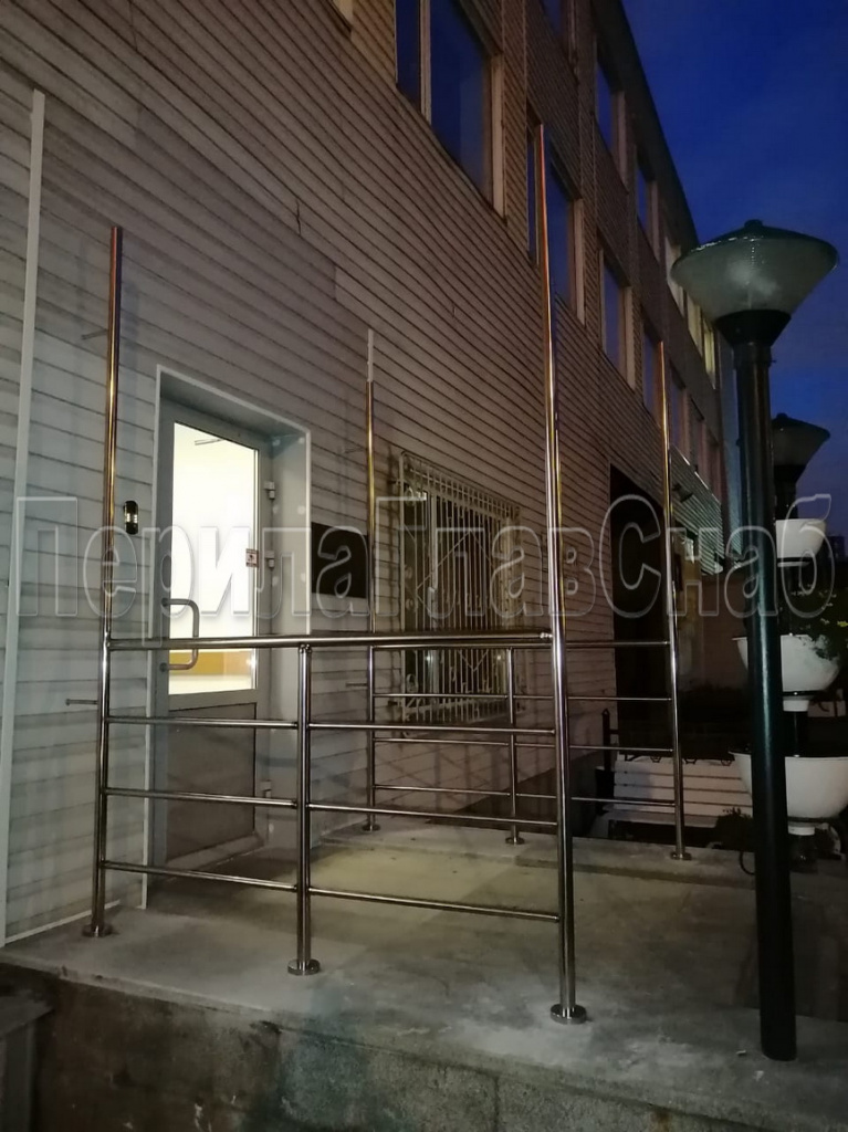 Конструктив: Козырёк на каркасе из нержавеющей стали AISI 304 с дополнительными поручнями на крыльце, навес выполнен из монолитного поликарбоната 8.0 мм.