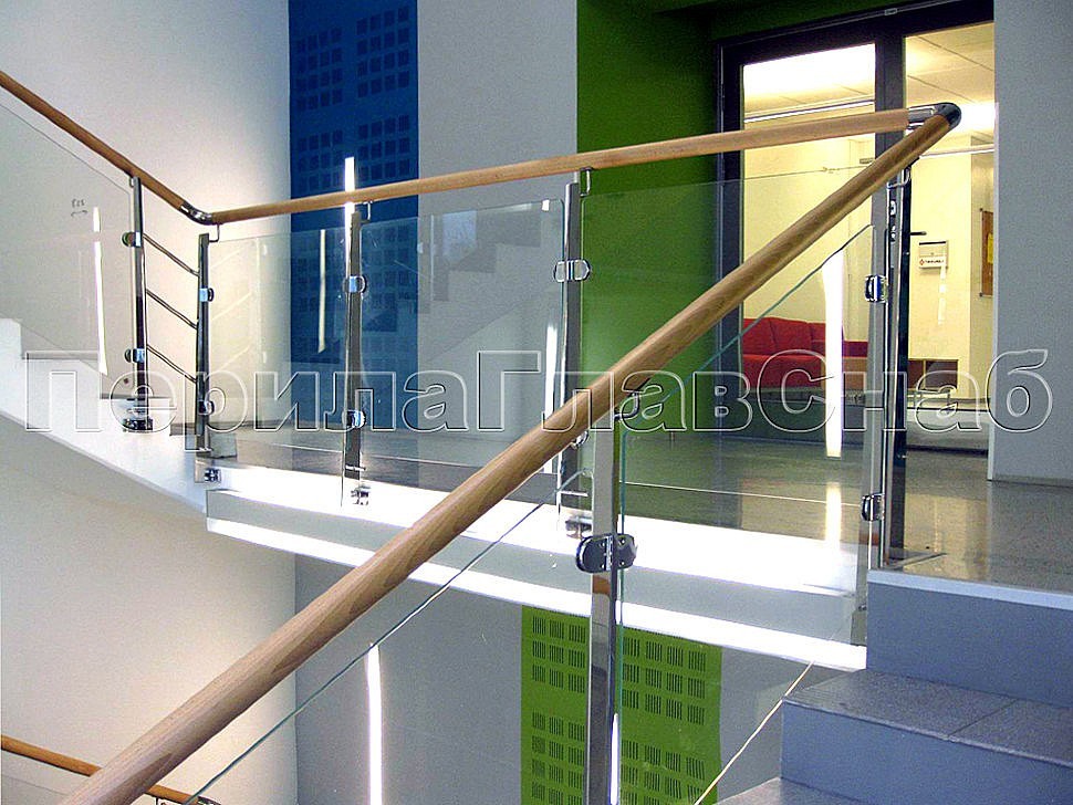 В здании офиса TIKKURILA в Москве было установлено ограждение лестницы со стеклом и деревянным поручнем на торцевых профильных полированных стойках из нержавеющей стали.