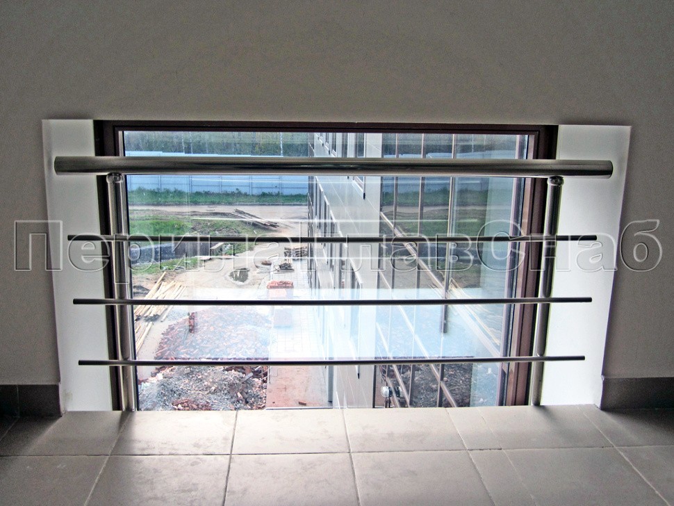 Ограждение лестницы из нержавеющей стали с дополнительным поручнем для инвалидов.Наконечники стоек в виде штырей, поручень для инвалидов крепится на выносных держателях.