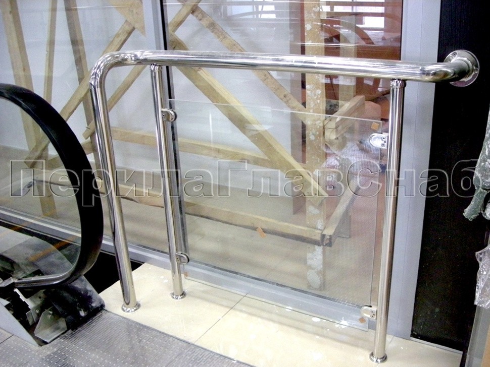 Стеклянное ограждение эскалатора торгового центра с дополнительным отводом поручня для защиты движущихся частей и механизмов