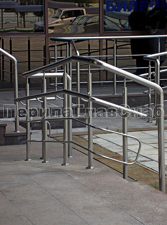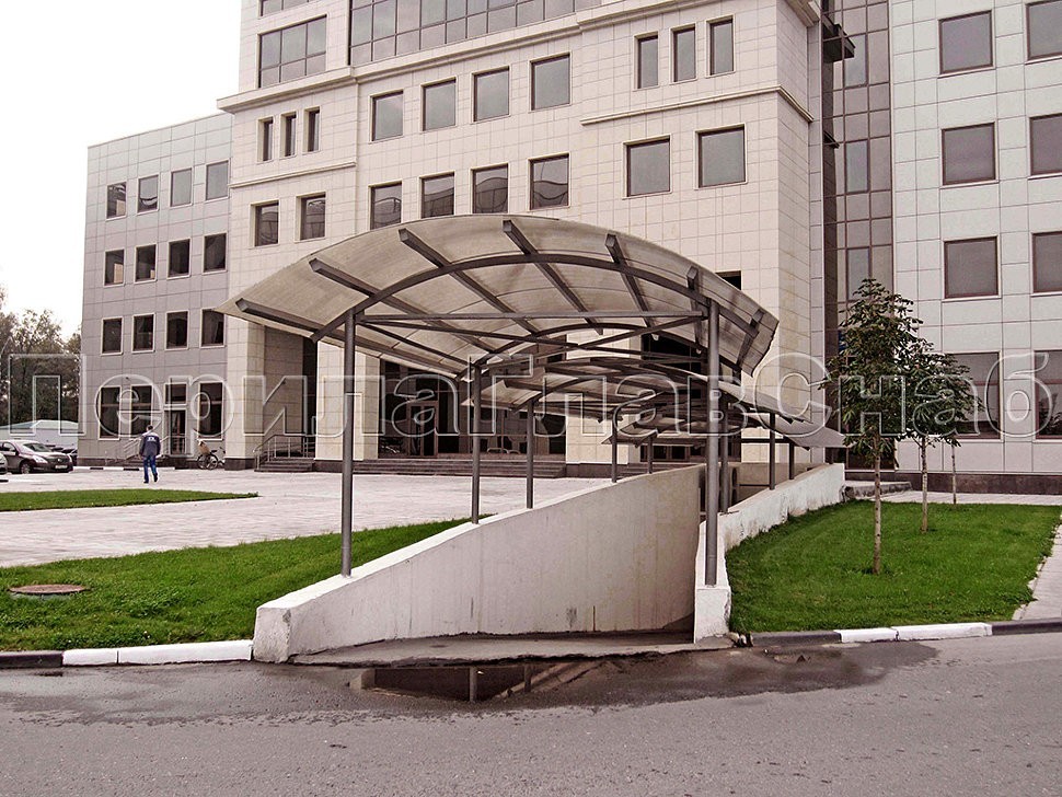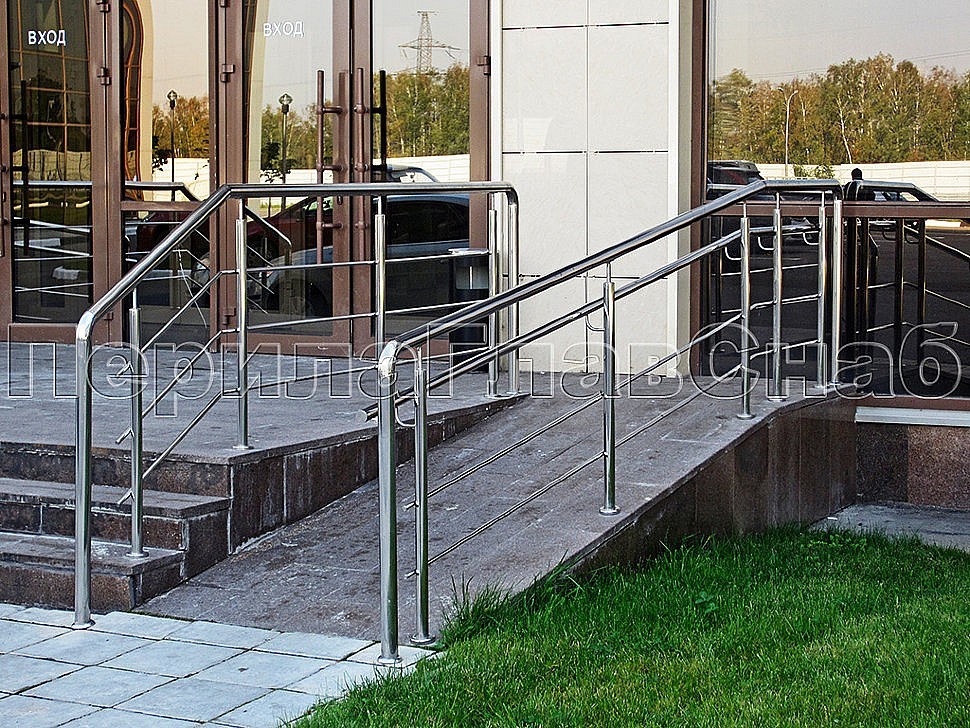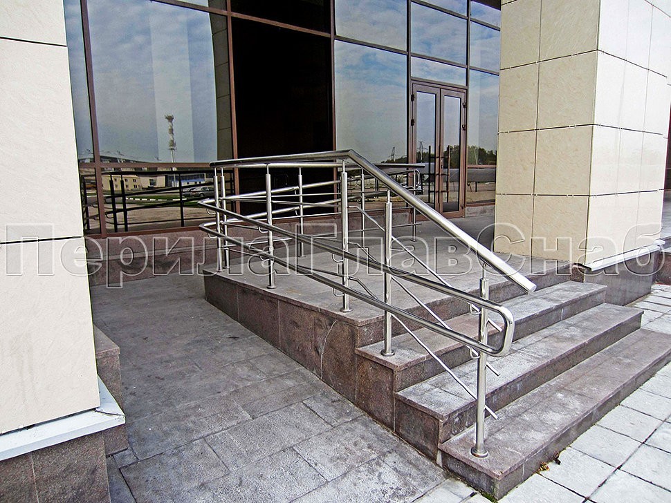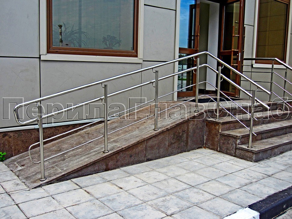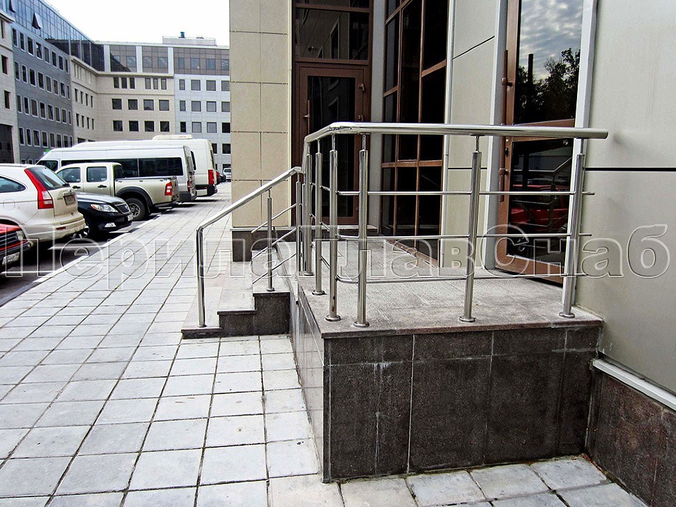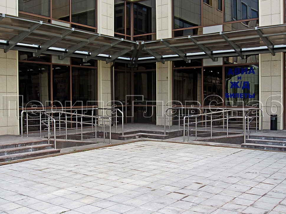 Входные группы похожей по стилю конструкции отлично вписываются в ландшафт. Окончания поручней уходят в пол, что придает дополнительную надежность. Очень часто на объекте встречаются и инвалидные пандусы. Для объектов комплекса Гринвуд ограждения выполнены с полным соблюдением ГОСТ Р 51261-99 УСТРОЙСТВА ОПОРНЫЕ СТАЦИОНАРНЫЕ РЕАБИЛИТАЦИОННЫЕ. Этот ГОСТ регламентирует нормативы на стационарные опорные устройства, которые необходимо устанавливать в общественных зданиях, доступных для инвалидов.