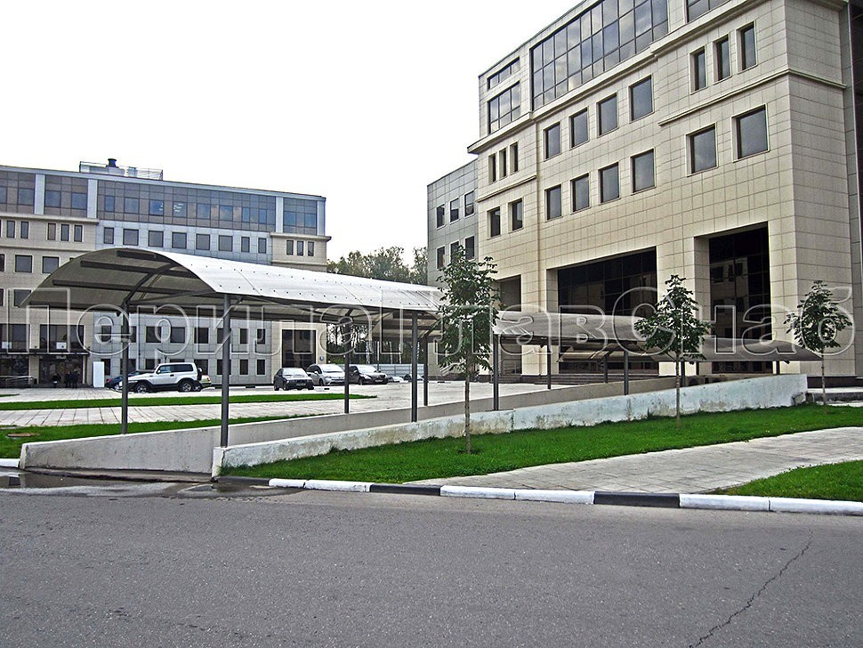 В нескольких местах были установлены односкатные и полусферические козырьки. На входе по стилю подошел больше козырек с опорами из нержавеющей стали в форме трапеций. А на выезде из подземных технических помещений установлены более простые круглые опоры.