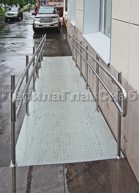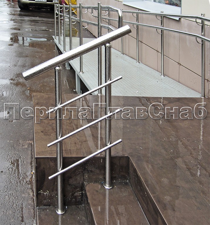 Ограждение на металлической платформе. Двойной поручень 50-й трубы сделан специально для удобства пользования людей с ограниченным возможностями в передвижении.