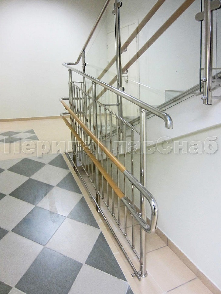 Ограждение лестницы и пандуса в детском саду. Поручень для взрослых из нержавейки и двойной деревянный детский поручень.