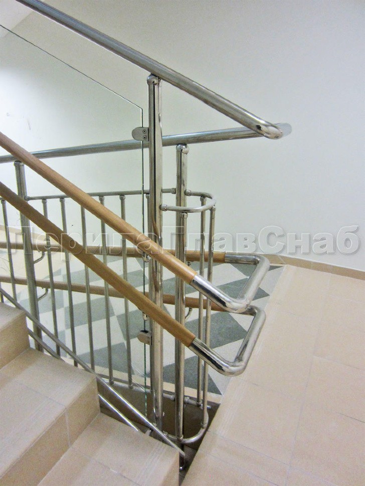 Ограждение со стеклом (на зажимных стеклодержателях) и стойками. Стойки установлены в торец ступеней. Поручни завязаны на поворотах.