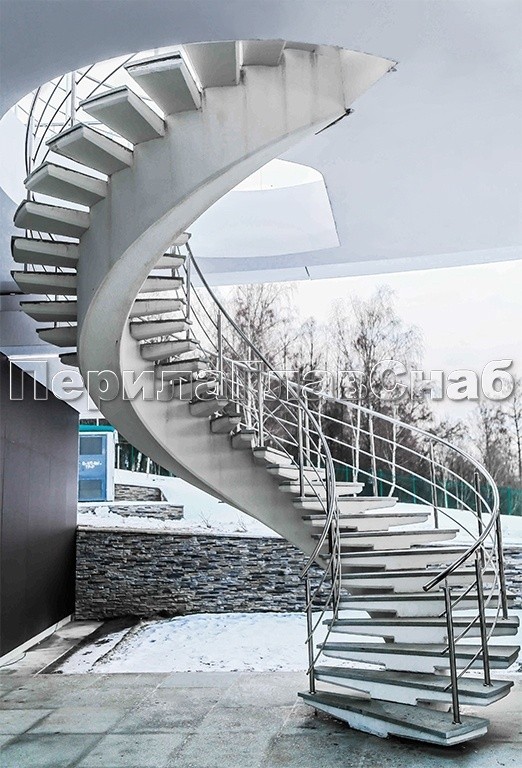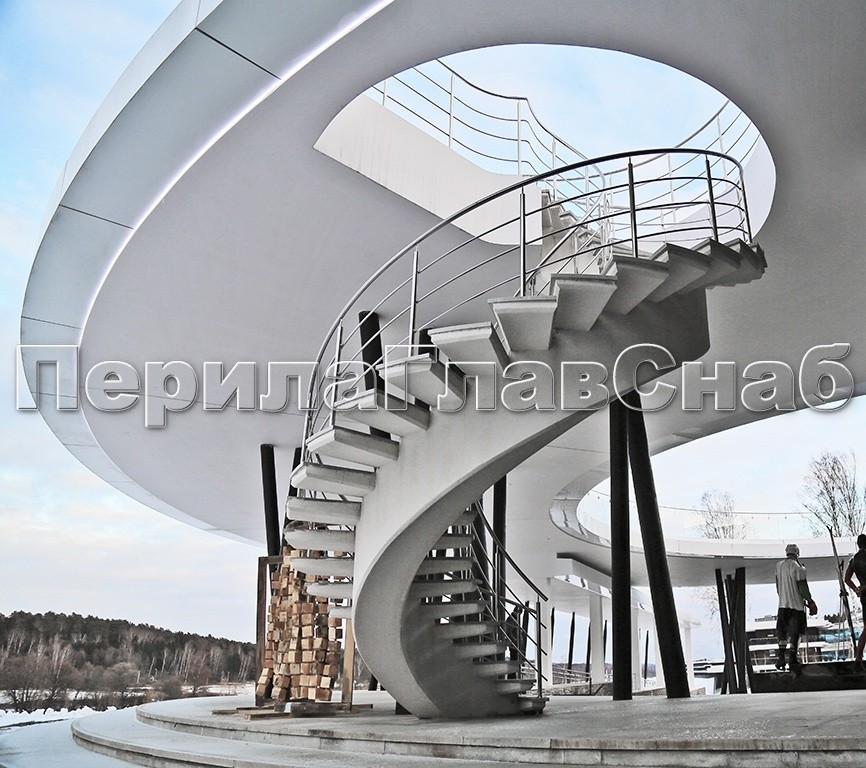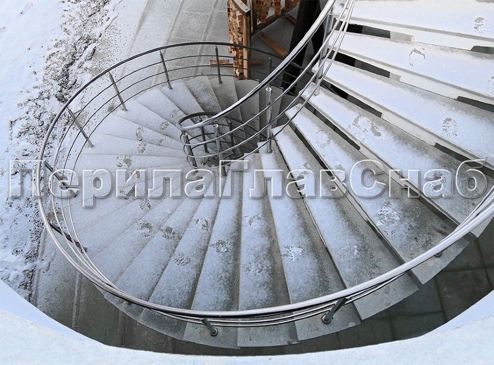 Ограждение винтовой лестницы из нержавеющей стали. Ограждение второго этажа на несущем стекле с поручнем на выносных стеклодержателях.