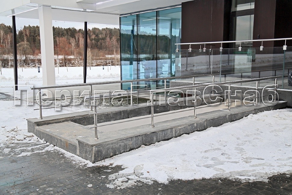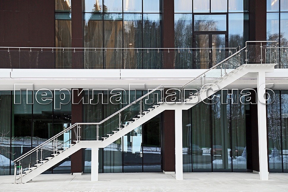 Ограждение лестницы выполнено на стойках с креплением в ступень, в качестве заполнения стекло на зажимных стеклодержателях.