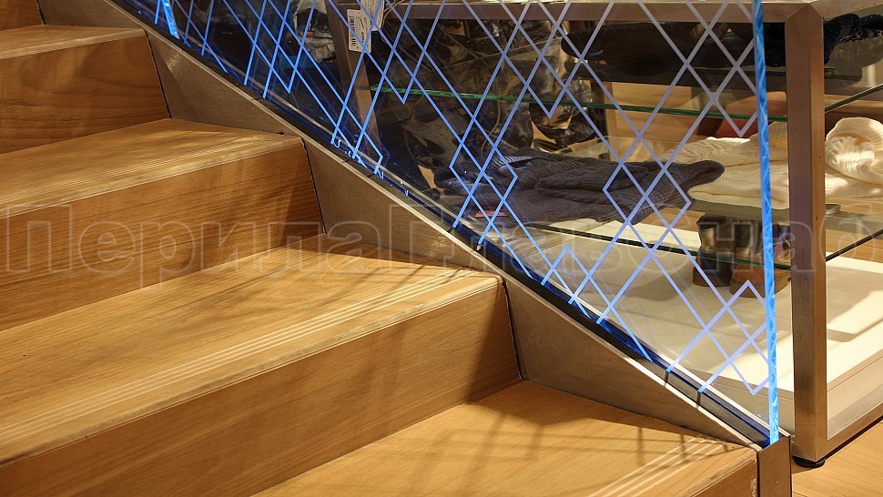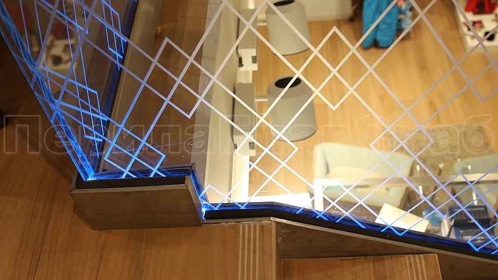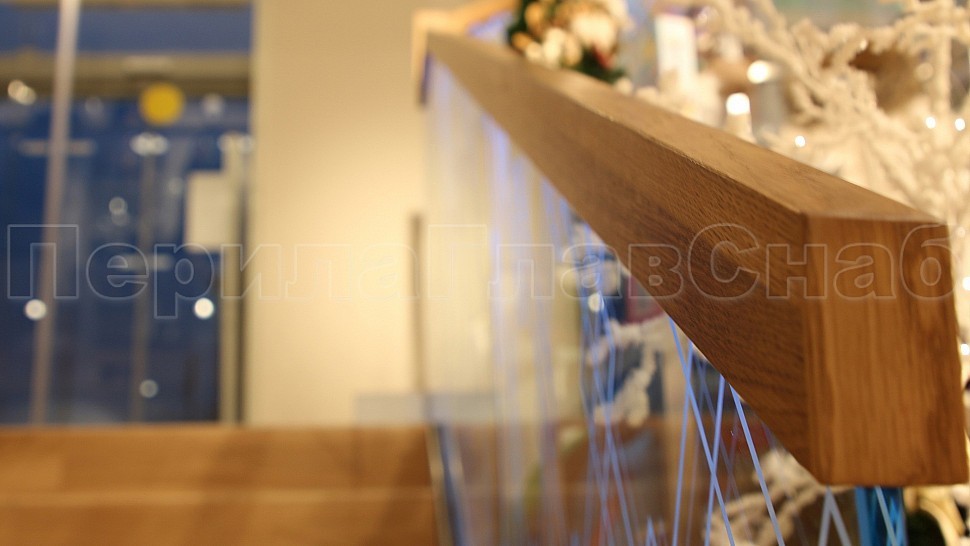 Поручень дубовый клееный по длине и толщине прямоугольный с пазом под стекло габаритами 60х40 мм с лаковым матовым покрытием в один слой. Поручень завязан на поворотах. На стекле с внешней стороны рисунок ромбов нанесенных методом пескоструйной обработки с покрытием защитным лаком. Ширина линий рисунка 5 мм.