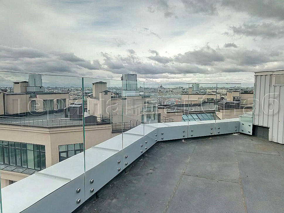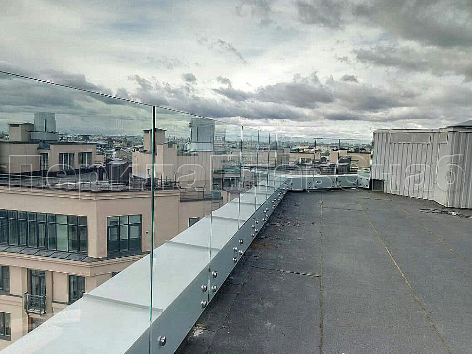 В северной столице установили стеклянные ограждение кровли на точечном креплении. Что бы укрепить конструкцию, сверху стекол мы смонтировали П-образный профиль AISI-304 из нержавеющей стали, благодаря которому стекла будут надежно закреплены. Стекло прозрачное, закаленный триплекс толщиной 8+8мм с полировкой кромок по периметру каждого стекла. Высота стекла 1500мм. Стекло крепится в ж/б парапет на нержавеющих держателях (шпильках) стали марки AISI-304 Ф16мм