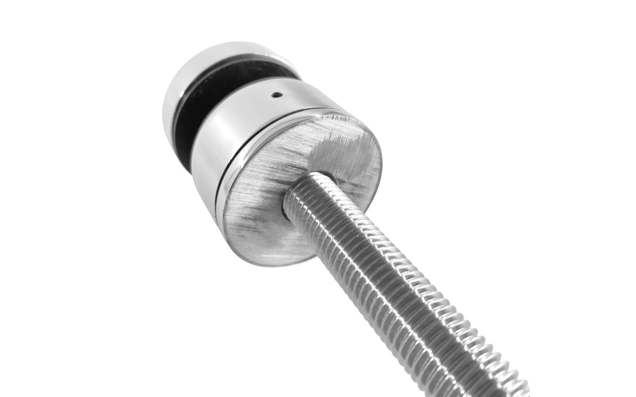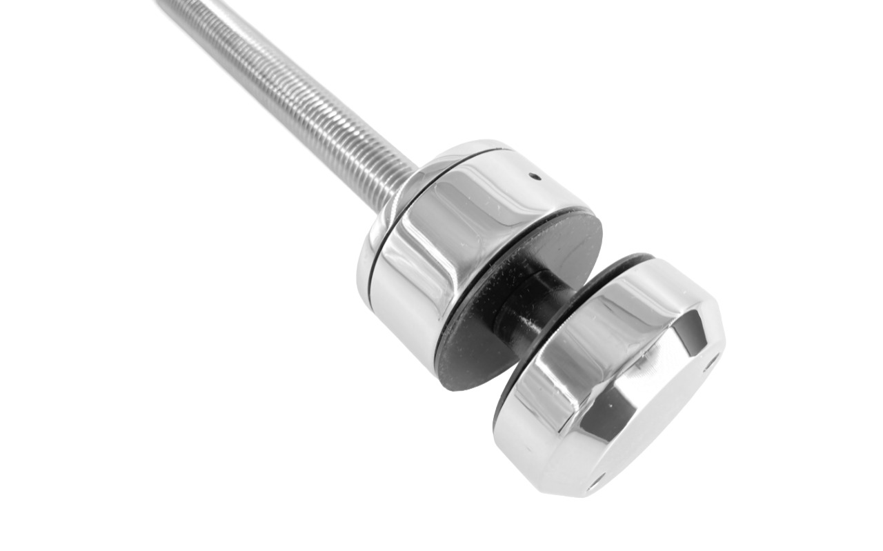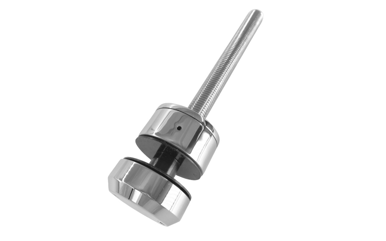 Точечный стеклодердатель для торцевого крепления несущего стекла. Шпилька диаметром 16 мм. Диаметр наружной (18 мм, хрюшка) и внутренней (10 мм) шайб по 50 мм. С регулировкой вылета 25-39мм.